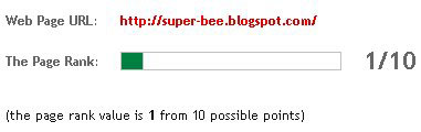 Sebenarnya google memberikan pagerank 1 kepada blog Super-Bee ini sudah 3 hari, dan sayapun tidak percaya. Kemudian saya coba untuk memastikannya dengan menggunakan tool prchecker, ternyata benar bahwa blog Super-Bee ini sudah memiliki pagerank. Padahal kalau dihitung-hitung saya mulai blogging aktif itu baru 4 bulan dan baru memiliki sekitar 100 lebih postingan, hehehe.. Alhamdulillah ya sesuatu ala syahrono.